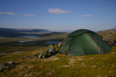 Als wir dann prustend und schwitzend den Gipfel stürmten fanden wir auch bald eine geeignete Stelle zum campieren, mit reichlich Wasser und einem herrlichen Ausblick auf das unter uns liegende, mit zahlreichen Seen durchsetzte Tal.