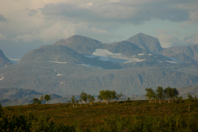 Von hier aus hatten wir zwei Möglichkeiten, um das ungefähr 800 Meter tiefer gelegen Sulitjelma zu erreichen. Entweder über die (leider) stark befahrene Landstraße oder über einen kleinen Trampelpfad, der auf einer meiner Karten eingezeichnet war. Natürlich erschien es mir sicherer, auf dem Trampelpfad in das Tal zu gelangen und so machte ich mich auf die Suche nach dem Einstieg, was sich als schwieriger herausstellte als erwartet. Ein Beerenpflücker, den ich traf, erzählte mir, bei dem auf der Karte eingezeichneten Pfad handle es sich um einen sehr alten Weg, der heute gar nicht mehr genutzt wird. Leider wusste er nicht, wo genau er beginnt.